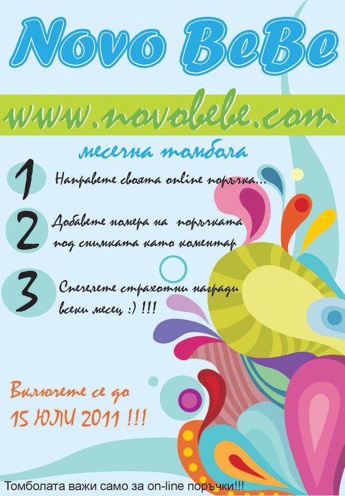 Томболата е обвързана с покупка.Пазарувайте online от магазин "Novo Bebe" и спечелете страхотни награди любезно предоставени от X-lander, Fisher Price, Tommee Tippee !!!Направете своята онлайн поръчка, добавете номера и под специална снимка в албума във фейсбук и очаквайте наградите.Краен срок - 15 юлиУчаствайте...